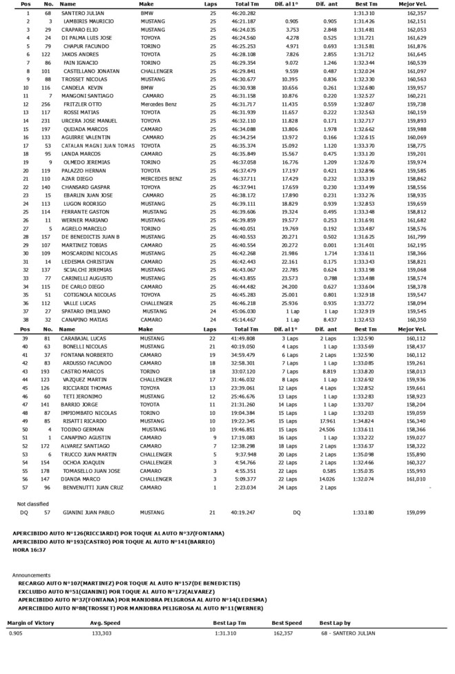 En una Final muy cortada por las 4 intervenciones del auto de seguridad, “Josito” Di Palma terminó 4º en su 2ª carrera con el Toyota Camry del RUS Med TeamFacundo Chapur (Torino NG) coronó con el 5º puesto en la Final una gran remontada, que comenzó desde el 15º puesto de largada y se construyó a base de varios sobrepasos destacados.