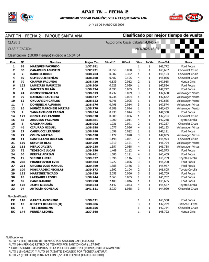 Posterior a la clasificación, fueron excluidos por técnica (altura) los pilotos Antonino García y Ricardo Risatti, mientras que fueron aplicados los retiros de tiempo a Leonel Pernia y a Jerónimo Teti. En tanto, Lucas Tedeschi fue recargado con 0s500 por cambio de motor, conforme indica para esta situación el reglamento deportivo.